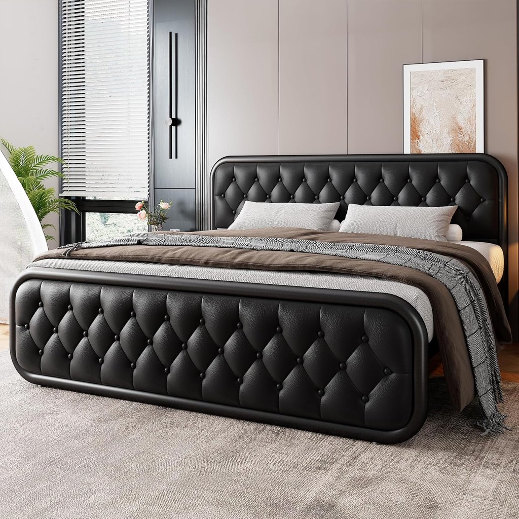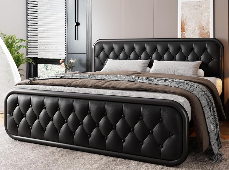 Black leather tufted bed frame