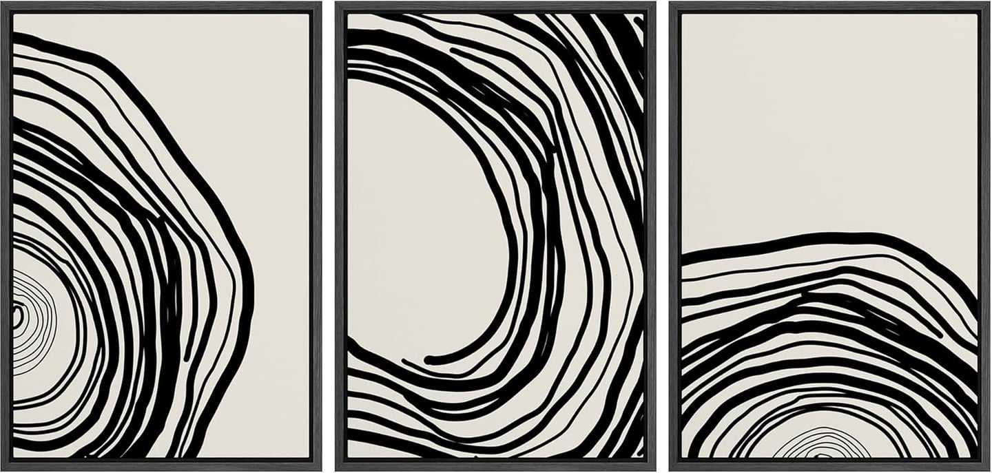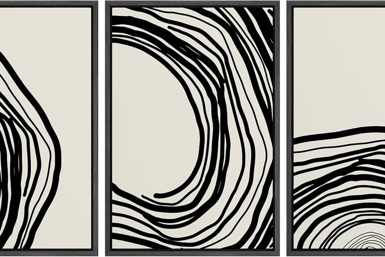 Black abstract swirl triptych art
