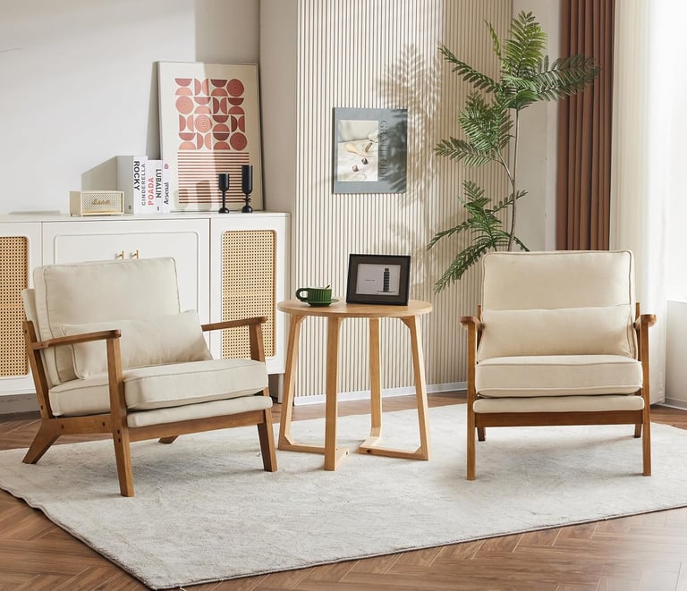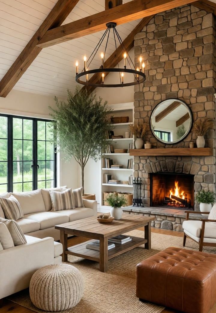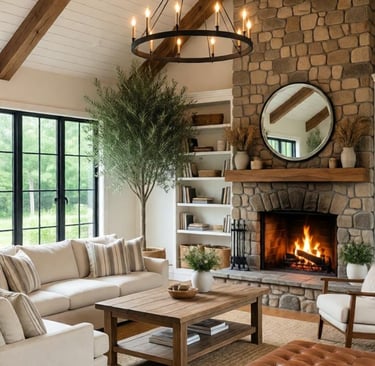 Raw materials, warm textures, and the kind of lived-in comfort that feels like it took years to build. This room pairs natural stone, weathered wood beams, and soft neutral upholstery for a look that's rugged and refined at the same time. Every piece was chosen to capture that feeling.