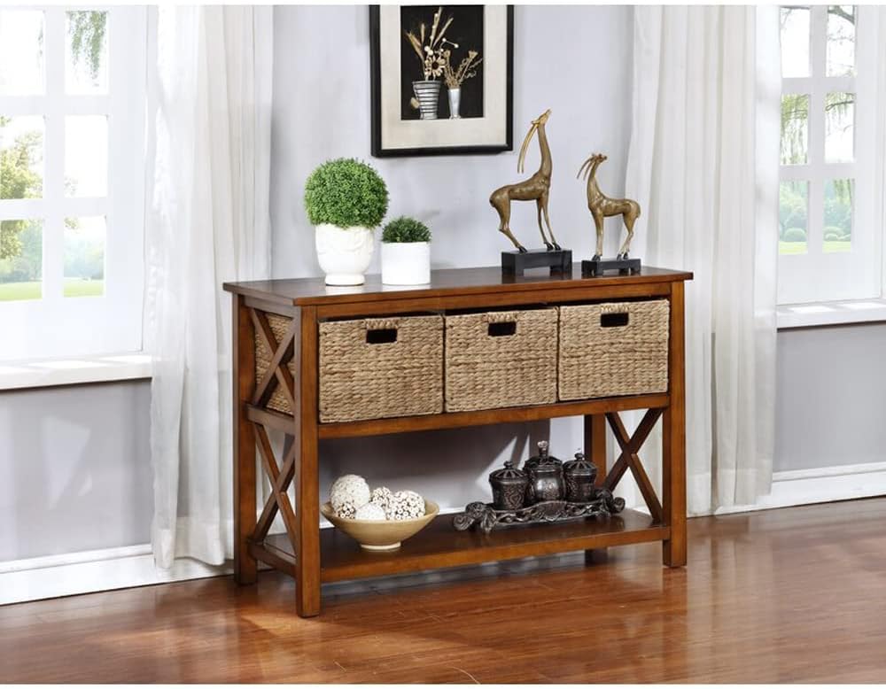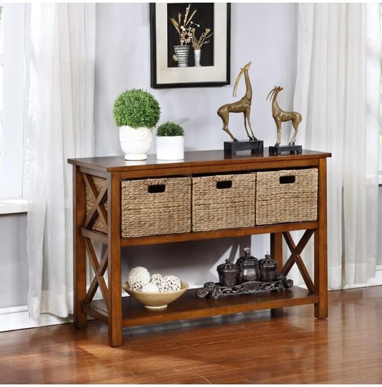 A console table with built-in wicker baskets solves two problems at once...structure for the space and storage underneath. The eHemco Console Table with 3 Wicker Baskets keeps everyday items out of sight but easy to grab...and looks beautiful doing it.