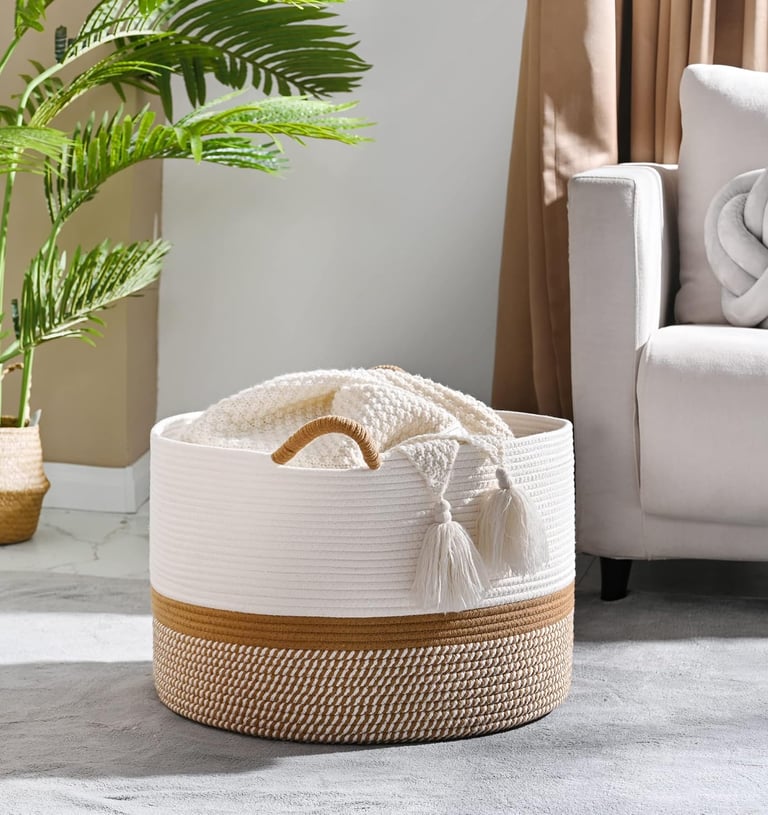 Place a large cotton rope blanket basket next to your sofa or bed and fill it with throws. The texture of the basket paired with a soft textile instantly warms up the space and makes the room feel styled without adding clutter.
