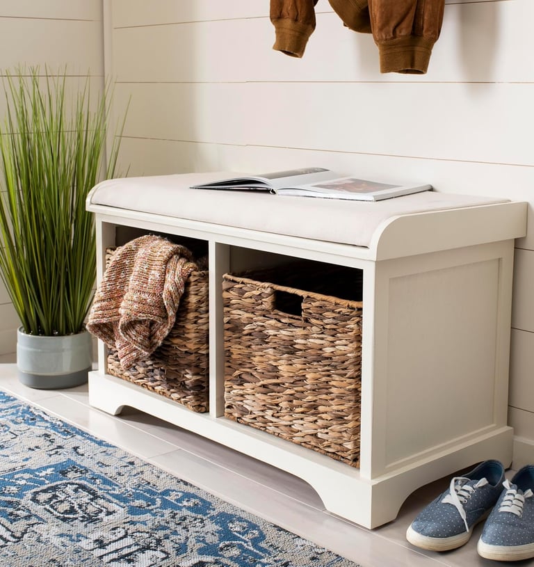 A storage bench with wicker baskets pulls double duty...a place to sit while you put on shoes and built-in basket cubbies underneath to keep everyday items contained. Perfect for an entryway, mudroom, or bedroom.